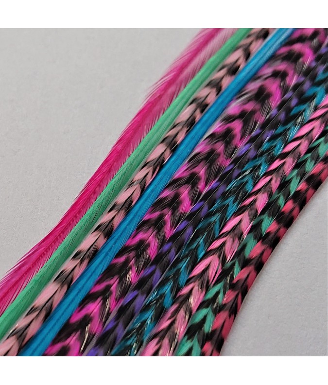 Ce lot comprend les perles de fixation et 50 plumes de 24 à 32cm , mix de rose, rose pale, saumon, turquoise, lavande, lagon, fuschia. Large majorité de plumes rayées. Le lot préféré des jeunes filles ou des pros dont la clientèle est jeune et estivale. Si vous désirez une personnalisation, contactez-moi lors de votre commande.