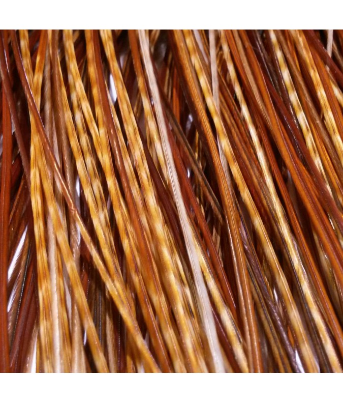 Vous recevrez une plume de couleur rousse dont la partie inférieure est doucement rayée rousse et blonde, d'une longueur de 20 à 24 cm ! Très jolies.