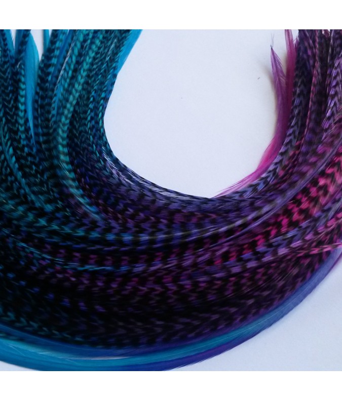 Vous recevrez un duo de plumes XL dégradées de turquoise à rose, avec une pointe de violet, une rayée et une unie, d'une longueur supérieure à 24cm. Avec une perle de fixation par plume de la couleur de votre choix, blond, chatain, brun aubrun, brun ou noir! Le tout à choisir dans le volet déroulant!