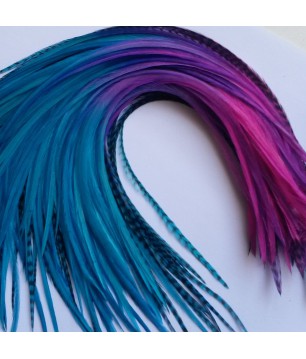 Vous recevrez un duo de plumes XL dégradées de turquoise à rose, avec une pointe de violet, une rayée et une unie, d'une longueur supérieure à 24cm. Avec une perle de fixation par plume de la couleur de votre choix, blond, chatain, brun aubrun, brun ou noir! Le tout à choisir dans le volet déroulant! plus de détails plus bas